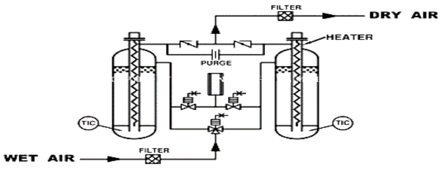 Heat Reactivated dryers are used when one needs compressed air of very low Dew point of (-) 60˚C or (-) 80˚C. In this design, the desiccant is regenerated at higher temperature, along with small quantity of Dry air purge. Due to purging with Dry air and thermal regeneration, residual moisture loading on desiccant becomes low and this gives very low Dew points.